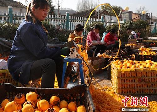 资料图:陕西省陇县天城镇范家营村农户正在采摘柿子,进行柿饼深加工。在当地政府扶贫干部帮助下,该村以合作社加农户方式,正在以采摘、深加工、销售一条龙服务模式脱贫。 中新社记者 宋吉河 摄