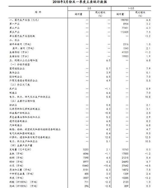 初步核算,一季度国内生产总值198783亿元,按可比价格计算,同比增长6.8%。分产业看,第一产业增加值8904亿元,同比增长3.2%;第二产业增加值77451亿元,增长6.3%;第三产业增加值112428亿元,增长7.5%。