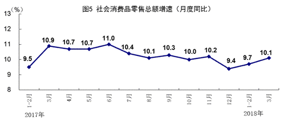 一季度,社会消费品零售总额90275亿元,同比增长9.8%,增速比1-2月份加快0.1个百分点,比上年同期回落0.2个百分点。按经营单位所在地分,城镇消费品零售额77096亿元,增长9.7%;乡村消费品零售额13179亿元,增长10.7%。按消费类型分,餐饮收入9711亿元,增长10.3%;商品零售80564亿元,增长9.8%。消费升级类商品销售增长较快,限额以上单位化妆品类、家用电器和音像器材类商品同比分别增长16.1%和11.4%,分别比上年同期加快6.2和3.4个百分点。3月份,社会消费品零售总额同比增长10.1%,比1-2月份加快0.4个百分点,环比增长0.73%。
