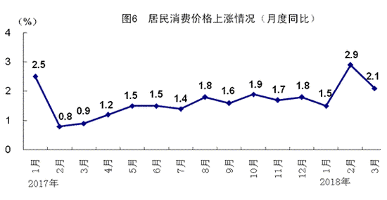一季度,全国居民消费价格同比上涨2.1%,涨幅比1-2月份回落0.1个百分点,比上年同期扩大0.7个百分点。其中,城市上涨2.2%,农村上涨2.0%。分类别看,食品烟酒价格同比上涨1.9%,衣着上涨1.2%,居住上涨2.4%,生活用品及服务上涨1.6%,交通和通信上涨0.7%,教育文化和娱乐上涨2.2%,医疗保健上涨6.0%,其他用品和服务上涨1.4%。在食品烟酒价格中,粮食价格上涨1.1%,猪肉价格下降9.9%,鲜菜价格上涨6.6%。3月份,全国居民消费价格同比上涨2.1%,涨幅比上月回落0.8个百分点,环比下降1.1%。